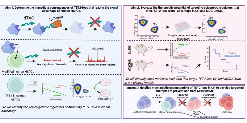We believe TET2 mutations alter blood stem cell function by turning key genes on or off, allowing mutant cells to outcompete healthy ones. Our research aims to understand how TET2 mutations affect blood stem cells and identify vulnerabilities that can be targeted with drugs. We will investigate and test a panel of drugs on TET2-mutated cells to find those that slow growth or encourage maturation into healthy cells. Promising drugs will be tested in mouse models of CH and MDS, and we will investigate why some cells resist treatment.