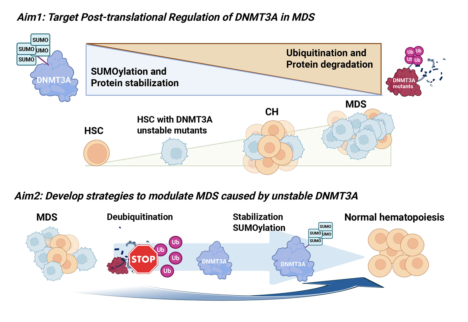 We are interested in a protein called DNA methyltransferase 3A (DNMT3A) that is important for the normal production of healthy blood cells. Changes, or mutations, in the DNMT3A gene are found in many blood cancers, including myelodysplastic syndrome (MDS). Importantly, DNMT3A mutations can be found in people’s blood cells many years before they develop MDS. These changes in DNMT3A cause blood stem cells, which are special cells that make all the other cells in the blood, to make many abnormal blood cells with mutant DNMT3A. This phenomenon is called clonal hematopoiesis (CH) and suggests that having DNMT3A mutations in their blood makes them more likely to get MDS. Our recent study has shown that many CH and MDS-related DNMT3A mutations are constantly being broken down at the protein level in blood cells. Based on our work, we believe that increasing the amount of DNMT3A protein could be a good way to treat and prevent CH and MDS. But we do not know exactly how DNMT3A protein is being broken down and whether stopping this process will be a helpful way to stop MDS from forming. In this proposal, our goal is to answer these important questions. These studies will enable us to find out how DNMT3A protein is broken down and to uncover which other genes and proteins might be involved in this process. If these studies are successful, we hope to develop a way to stop DNMT3A from being broken down for patients to improve outcomes for people with DNMT3A-mutant CH and MDS.